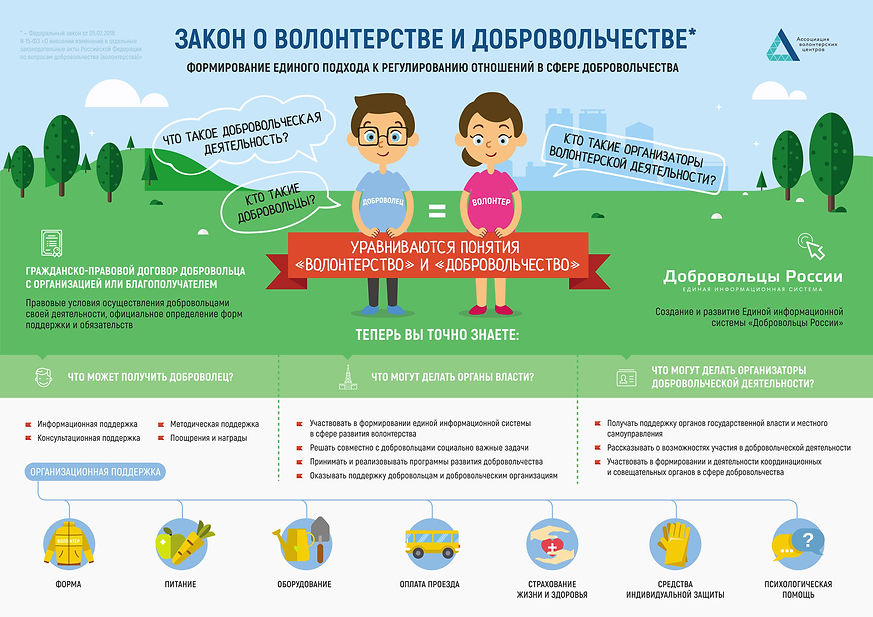 Согласно закону, у органов власти появилась возможность поддерживать организаторов волонтерской деятельности, в том числе в виде компенсации затрат и страхования. Аналогичную поддержку организаторы могут оказывать добровольцам. Ранее такие действия могли предприниматься лишь на основании гражданско-правового договора.